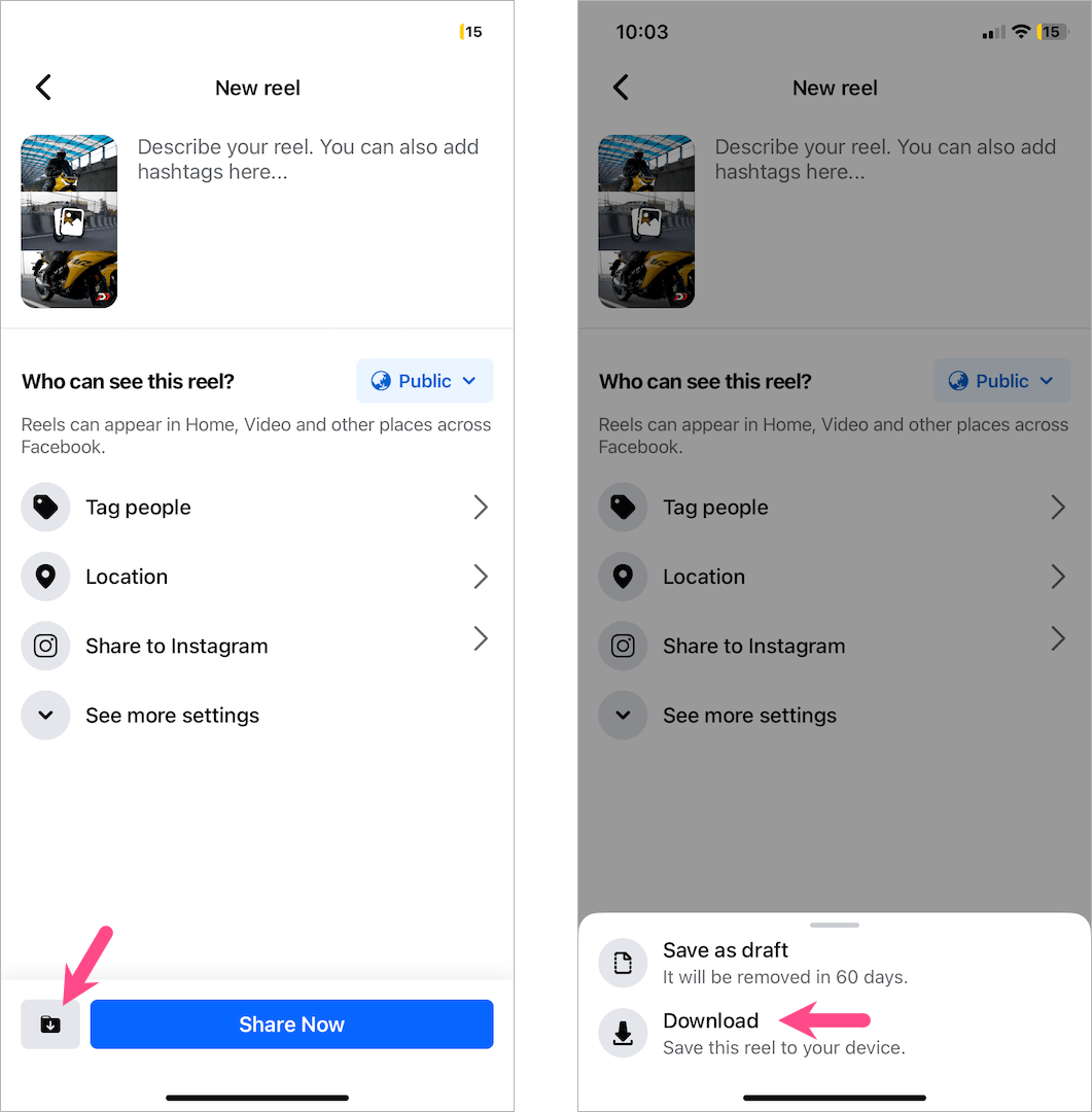 幸運的是,我們找到了一種解決方法,可以在不發布的情況下保存帶有音頻的捲軸。這個技巧涉及到使用 Facebook 上的 Reels 功能。與 Instagram 不同的是,Facebook 令人驚訝地允許用戶將他們的視頻保存到帶有音頻的相機膠卷中。