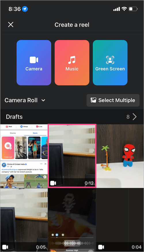 - 從您之前保存到設備的相機膠卷中選擇捲軸視頻。