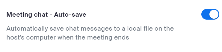 - 查找標有“會議聊天 - 自動保存”的選項。單擊切換按鈕將其啟用。啟用後,Zoom 會在每次會議結束時自動將所有聊天消息保存到您的計算機上。