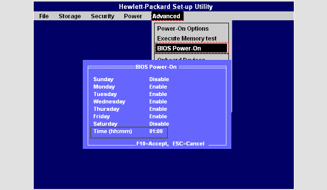 步驟2:在UEFI或BIOS設置屏幕中,尋找可以按計劃啟動您的PC的選項。可用的選項和所謂的選項將取決於您的PC。在HP PC上,該選項不在先進的>BIOS POWER-ON。選擇一個電動時間,以及一周中的哪一天。
