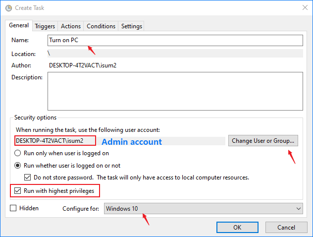步驟3:輸入從睡眠中醒來在姓名場地。您可能還想告訴它運行是否登錄用戶並將其設置為擁有最高特權。最後,單擊下一個。