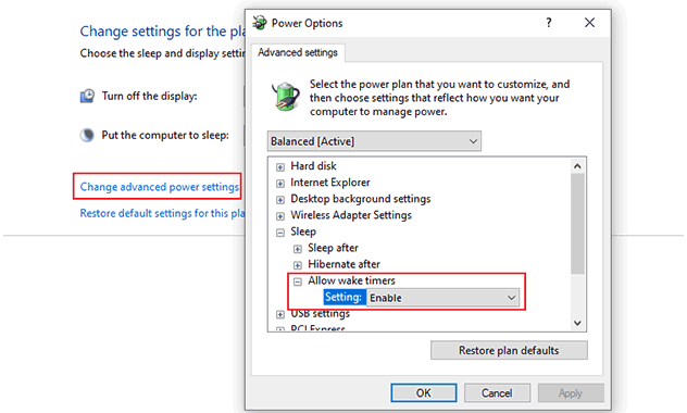 點擊更改計劃設置>更改高級電源設置,擴展“睡覺”部分,擴展“允許喚醒計時器”部分,並確保將其設置為“使能夠“。