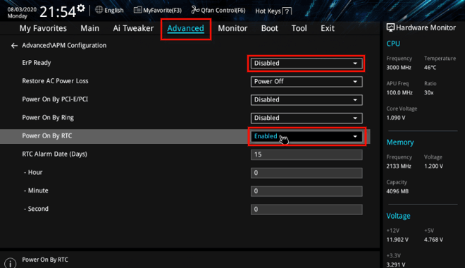 在華碩PC上,此選項在進階設定>APM配置>RTC上的電源。確保[ERP準備就緒]是禁用然後更改[RTC的電源]啟用如下。