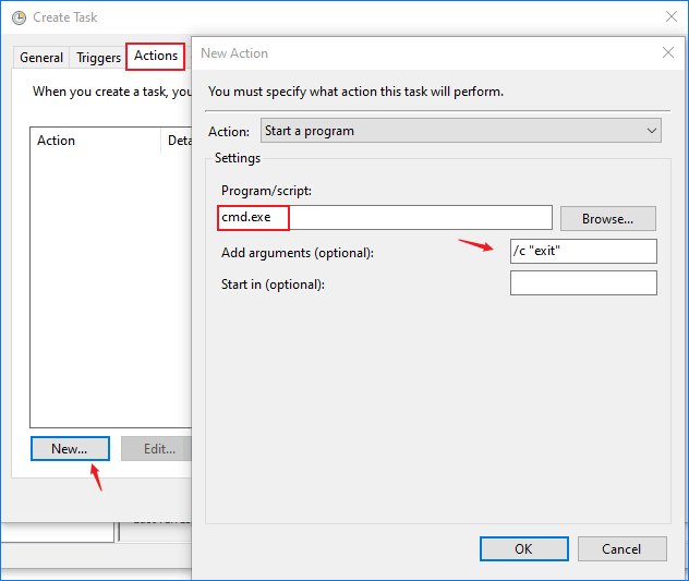 如果您想在不運行程序的情況下喚醒系統,則可以告訴任務/c“退出”參數 - 這將啟動一個命令提示符窗口並立即關閉,實際上什麼也沒做。