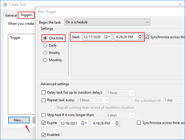 步驟4:在觸發器選項卡,創建一個新的觸發器,該觸發器在所需的時間運行任務。這可以是重複時間表或一次。