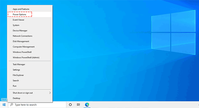 步驟5:打開電源並輸入Window10,在開始菜單中右鍵單擊Windows徽標,然後選擇電源選項。
