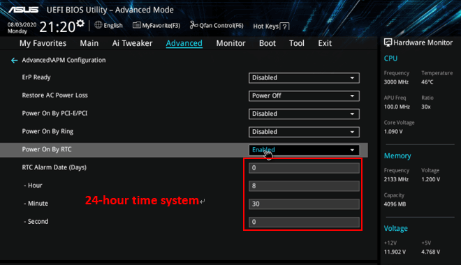步驟3:設置要喚醒設備的日子和時間。如果您希望主板每天在08:30上電動機,請按以下方式設置: