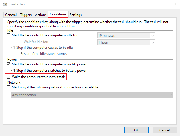 步驟6:在條件選項卡上,啟用喚醒計算機運行此任務選項。