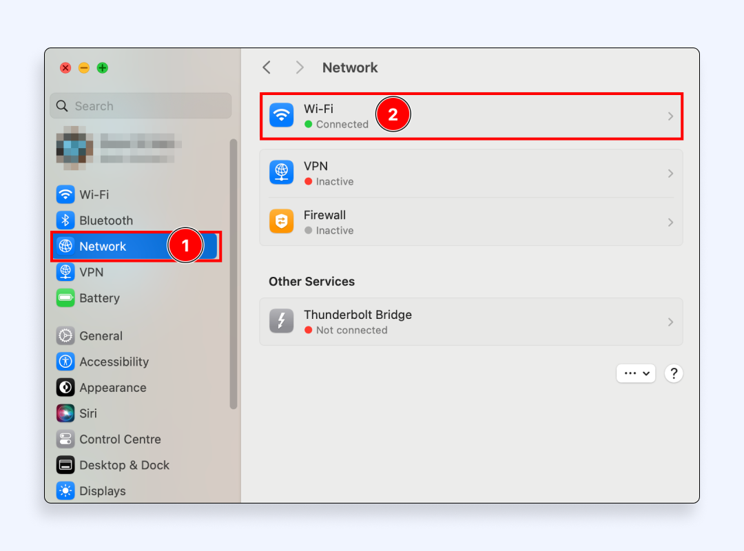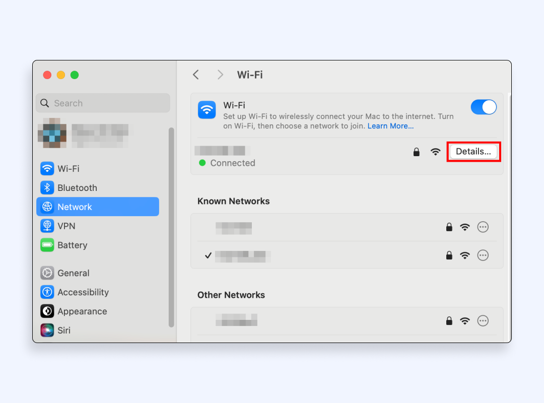 - 單擊“網絡”並在左側邊欄上選擇您的活動 Wi-Fi 連接。