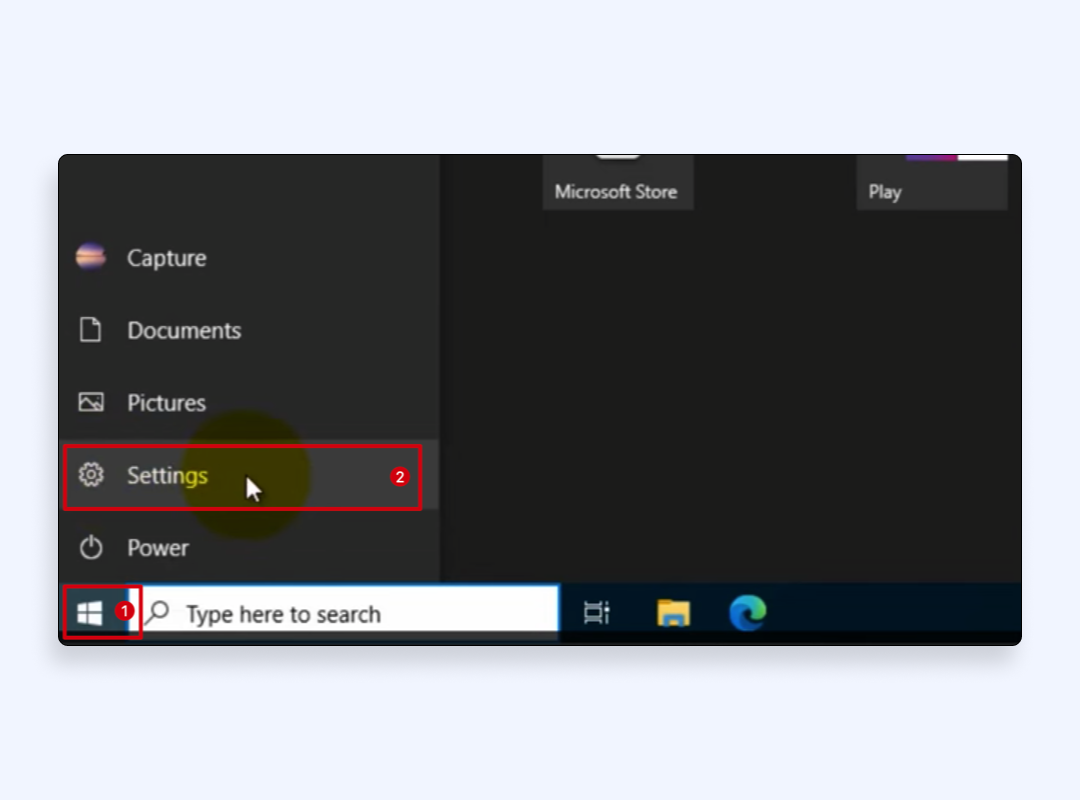 - 在 Windows 上,單擊左下角的“開始”圖標,然後單擊“設置”的齒輪圖標將其打開。