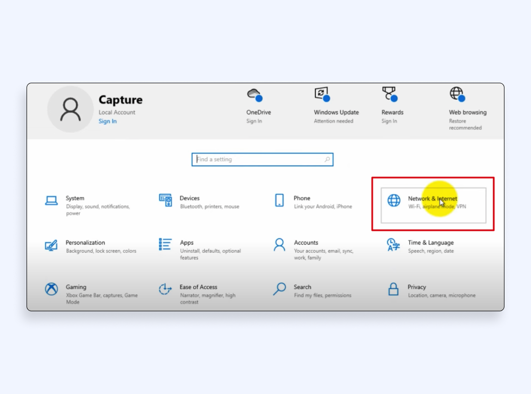 - 單擊“設置”窗口中的“網絡和 Internet”選項。