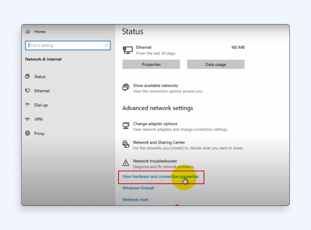 - 向下滾動到“高級網絡設置”部分,然後單擊“查看硬件和連接屬性”。