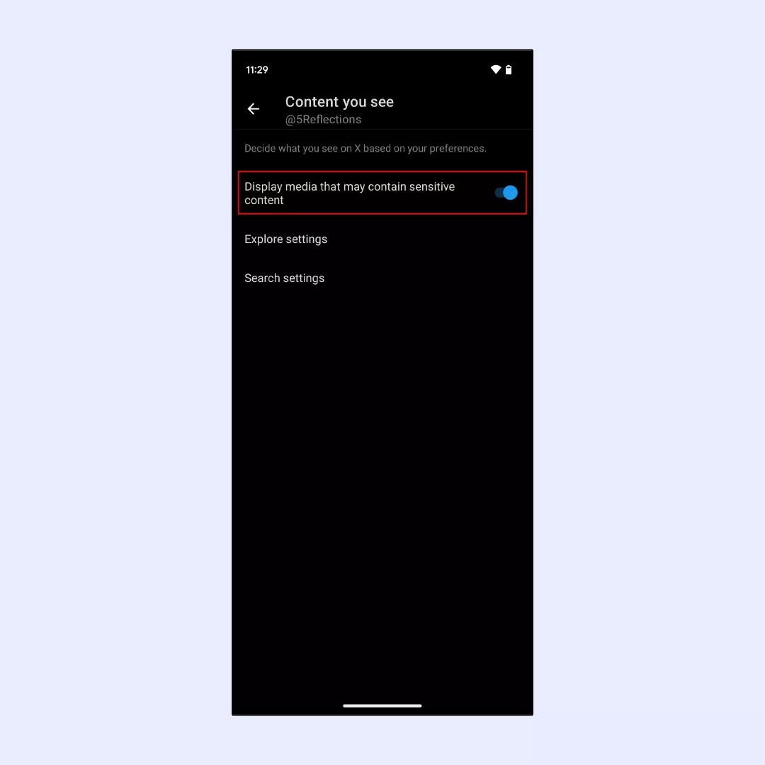 成功完成這些步驟後,您將立即能夠看到包含敏感內容的推文。然而,這些推文通常不會被搜索到。如果您希望允許 NSFW 材料,請按照以下步驟操作:
