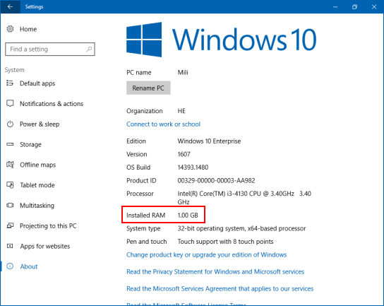 第 2 步:選擇關於在左側。 On the right side, you can see how much the installed RAM is.