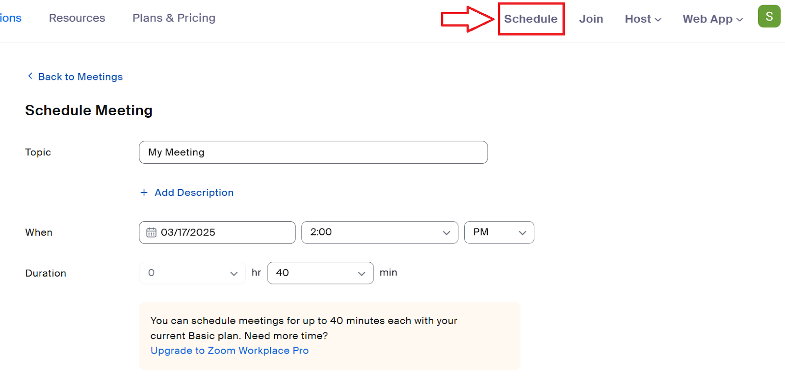- 點擊“日程”並輸入會議詳細信息,包括主題、日期、時間和持續時間。