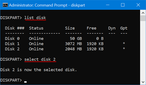 - 類型列出磁盤並按 Enter 鍵。下一個類型選擇磁盤#,其中 # 是要設為只讀的磁盤編號。