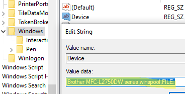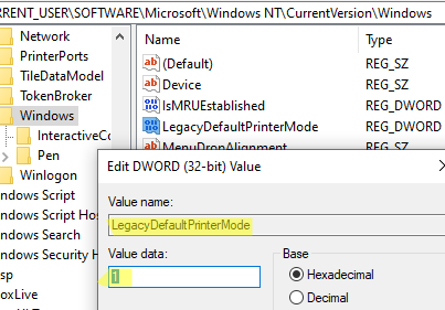 REG ADD "HKCUSOFTWAREMicrosoftWindows NTCurrentVersionWindows" -v LegacyDefaultPrinterMode /t REG_DWORD /d 1 /f
