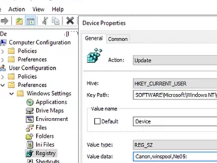 使用GPO在目標用戶計算機上創建此註冊表參數。這將更改用戶配置文件中的默認打印機集。編輯域GPO,轉到用戶配置- >偏好- >Windows設置- >註冊表,並創建一個具有以下設置的新項目: