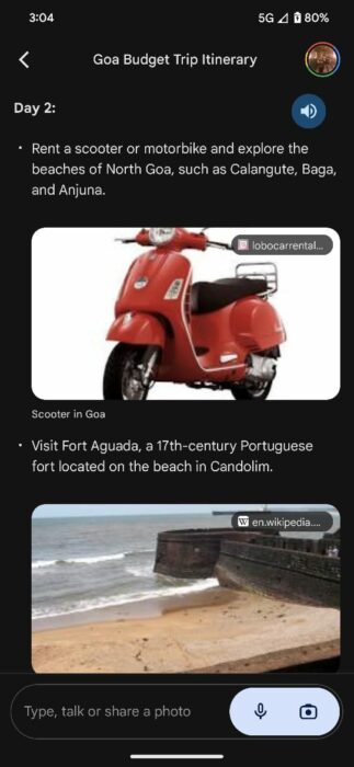 為了對這些助手進行測試,我們要求他們計劃一次 10,000 印度盧比以下的果阿旅行。從 VoiceGPT 開始,使用助手時的界面很小,並且不包含幫助規劃的圖像或文本。然而,這個聲音聽起來很人性化,感覺就像是在與一個真正的人交談,他在整個過程中熱衷於幫助我。考慮到我們向聊天機器人詢問了有關推薦經濟型住宿地點和冒險活動的信息,後續問題也得到了很好的處理。此外,這些對話的記錄存儲在 ChatGPT 應用程序中,任何人都可以回顧他們要求的內容以供將來參考。