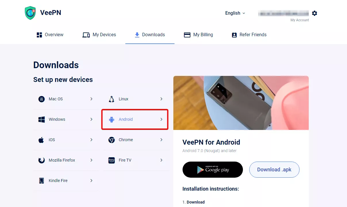 請按照以下步驟完成 Android 13 VPN 設置。筆記您還可以在 Android 12、11、10、Pie、Oreo 和 Nougat 上運行 VeePN。