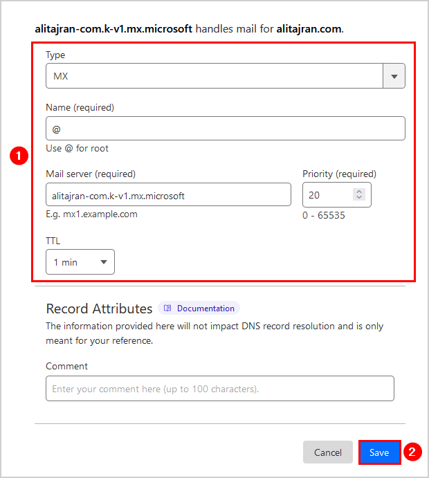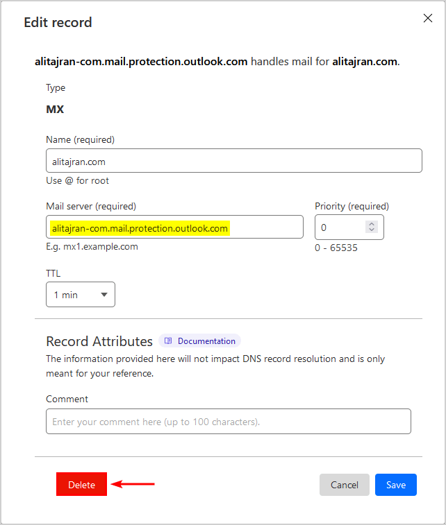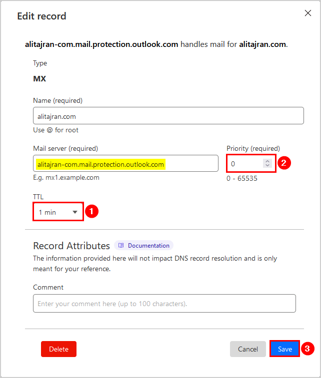 步驟 2. 更新 DNS 註冊器中的現有 MX 記錄 TTL