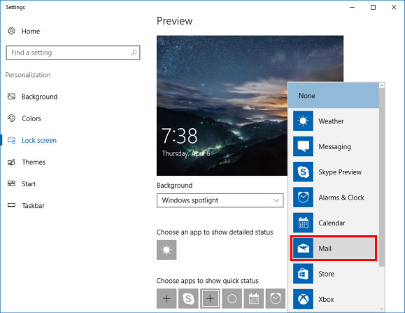 步驟 3:自定義哪些應用程序在鎖定屏幕上顯示信息。 Windows 允許單個應用程序在鎖定屏幕上顯示“詳細狀態”信息,並允許最多七個其他應用程序顯示“快速狀態”信息。