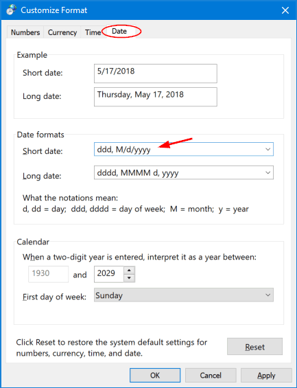 - 切換到日期選項卡,然後添加“ddd,” 開頭的字符串短日期場地。點擊好的你就完成了!