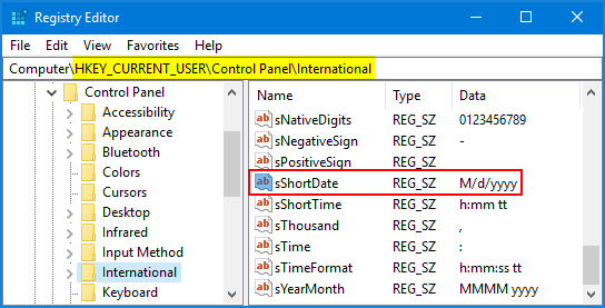 HKEY_CURRENT_USER\Control Panel\International - 按兩下短日期註冊表編輯器窗口右側的條目。