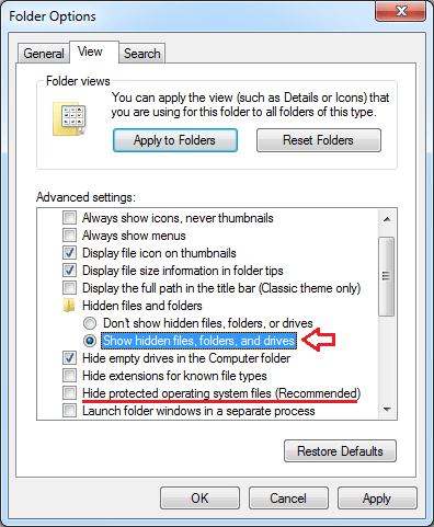 - 在“高級設置”部分下,單擊選擇“顯示隱藏的文件、文件夾和驅動器” 單選按鈕。如果您嘗試進入 Windows 目錄,您可能還需要刪除“隱藏受保護的操作系統文件(推薦)”也是如此。