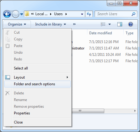 - 打開 Windows 資源管理器窗口,選擇組織->文件夾和搜索選項。