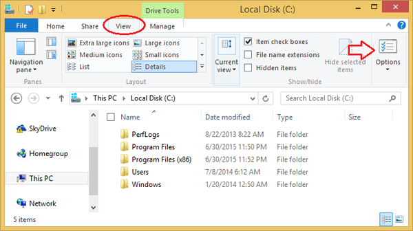 在 Windows 10 或 8 中,單擊看法Windows 資源管理器頂部的選項卡,然後單擊選項。