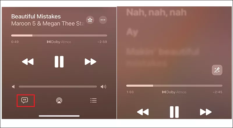 第4步:點擊Apple Music 上的歌詞按鈕(看起來像氣泡或文本行)位於屏幕的右下角。如果該歌曲的歌詞可用,它們將顯示在您的屏幕上。然後你就可以按照現場歌詞實時唱歌。