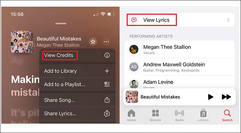 步驟2:點擊三個點,然後查看製作人員>查看歌詞。