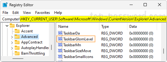 HKEY_CURRENT_USER\Software\Microsoft\Windows\CurrentVersion\Explorer\Advanced。雙擊 DWORD任務欄 Glom 級別在右側面板上。
