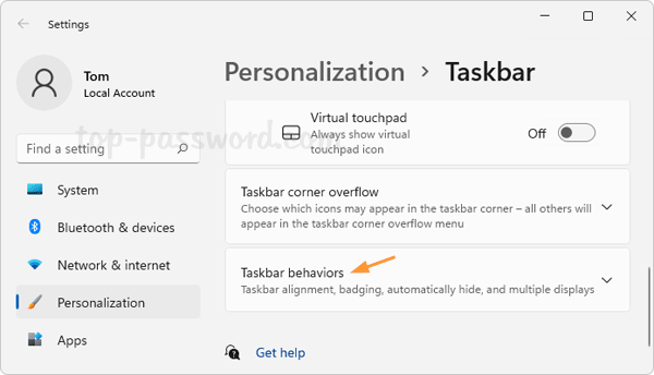 - 當“設置”應用程序打開“個性化”->“任務欄”時,單擊“任務欄行為” 在右側窗格中展開設置。