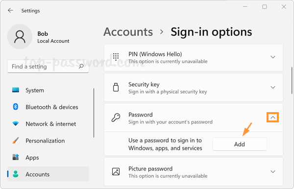 使用新創建的本地帳戶登錄 Windows 11 後,只需打開“設置”應用程序並導航至:賬戶->登錄選項。在登錄方式下,選擇密碼選項,然後您可以看到添加按鈕。
