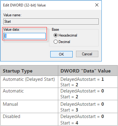 您可以將該服務設置為自動啟動(值數據 = 2)、手動啟動或禁用它。如果我想啟動該服務手動,所以我輸入數字3在那個盒子下面價值數據。