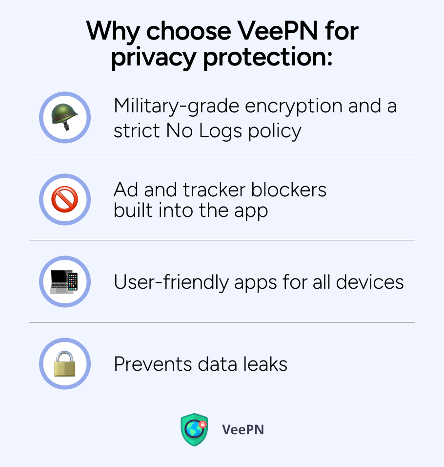 VeePN 提供一套全面的隱私工具,旨在確保您的信息安全: