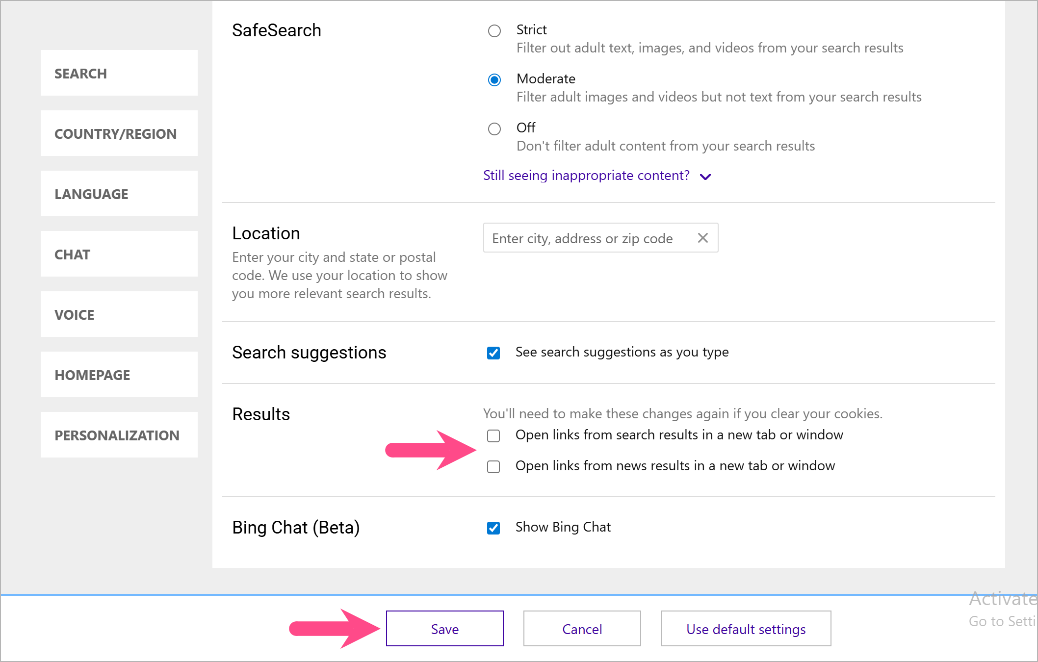 - Bing 搜索結果行為– 如果將 Bing 設置為默認搜索引擎,則默認情況下,Bing 搜索結果中的鏈接會在新選項卡或窗口中打開。