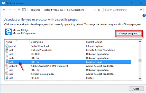 步驟 4:短暫加載後,它將顯示文件擴展名列表以及它們當前使用的各自默認程序。向下滾動以查找名為 .pdf 的擴展名,這樣您就可以看到 Microsoft Edge 是當前默認打開 PDF 文件的程序(如果您之前未進行更改)。要停止使用 Microsoft Edge 作為默認 PDF 查看器,請單擊 .pdf 條目將其選中,然後單擊“更改程序”按鈕。