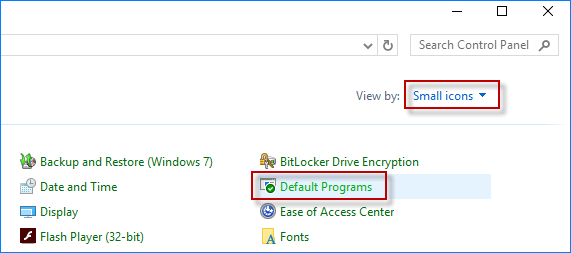 步驟 2:在控制面板上,選擇小圖標作為“查看方式”方法,以便您可以輕鬆地從所有控制面板項目中找到默認程序鏈接。單擊“默認程序”鏈接。