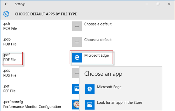 第 4 步:現在向下滾動以查找名為的條目.pdf(PDF 文件),因此如果您之前沒有更改過,您可以看到 Microsoft Edge 是 PDF 文件的默認應用程序。要停止使用 Microsoft Edge 作為默認 PDF 查看器,請單擊 PDF 條目後面的 Microsoft Edge,然後從彈出菜單中選擇另一個應用程序作為打開/查看 PDF 文件的默認應用程序。