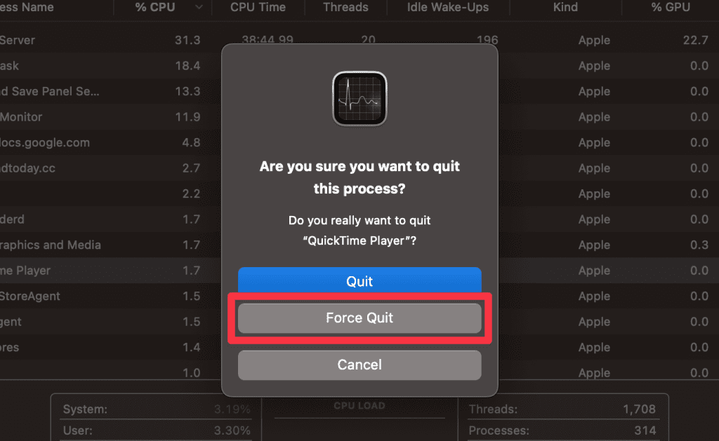 - 將出現一個確認窗口,詢問您是否確定要退出 QuickTime。點擊強制退出繼續。