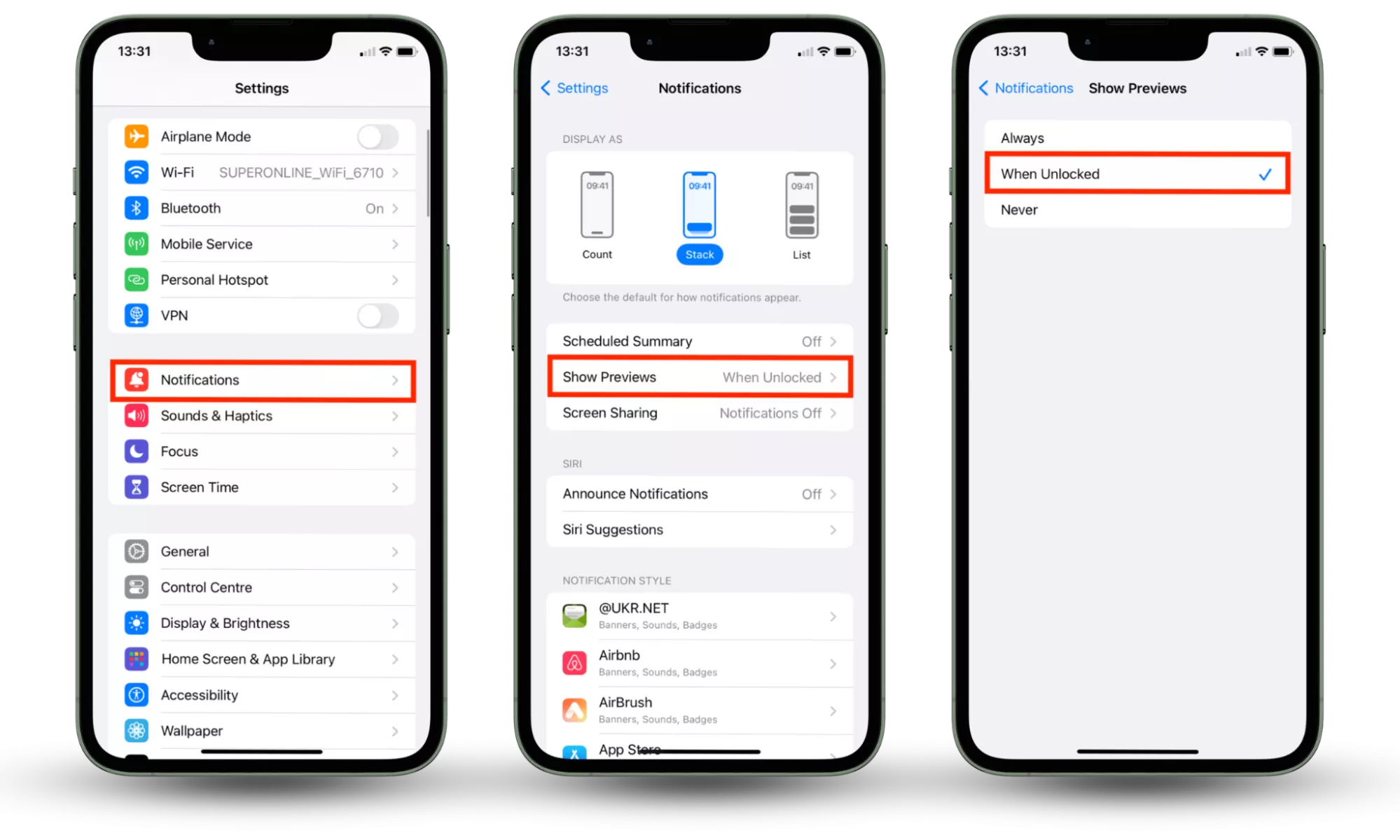 通過關閉鎖屏消息預覽,您可以防止其他人在不解鎖您的 iPhone 的情況下閱讀您的短信。這是增強您的隱私並確保只有您在閱讀您的短信的簡單方法。