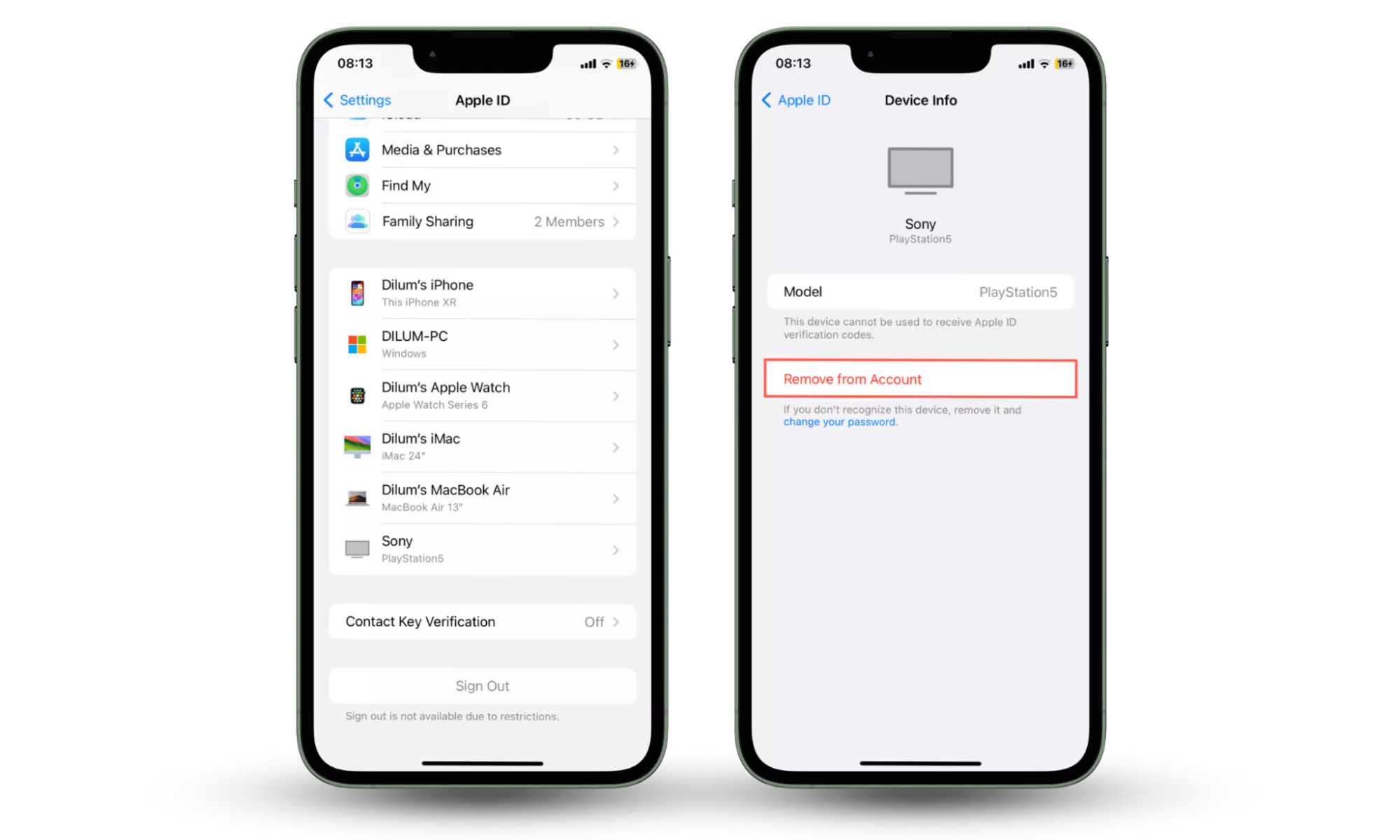 首先刪除您未在 iPhone 上安裝的程序,包括與您的 Apple ID 關聯的任何未知設備。