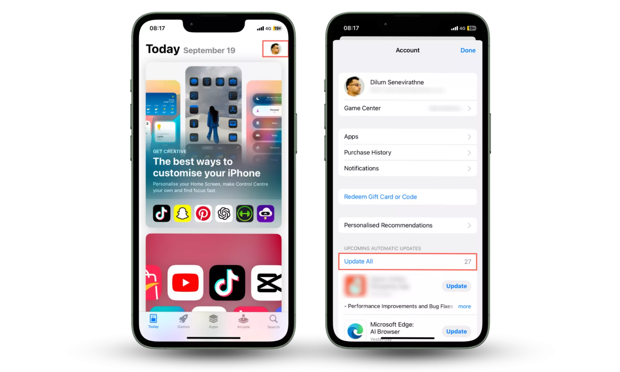 步驟 1-3:打開 App Store,轉到“帳戶”屏幕,然後點擊“全部更新”。
