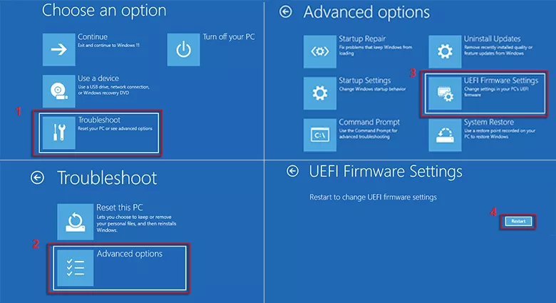 步驟35:選擇故障排除>高級選項>UEFI 固件設置