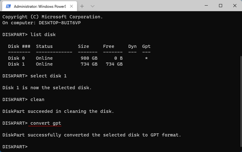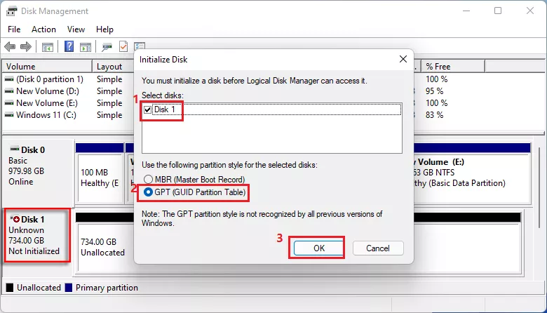 磁盤1.檢查磁盤1, 選擇GPT然後單擊好的。
