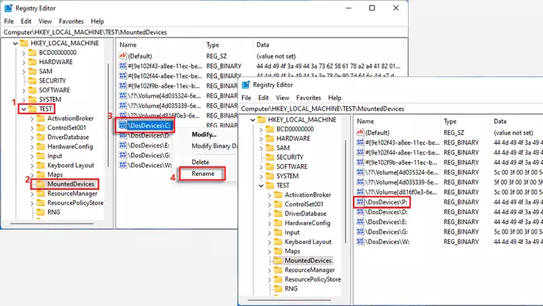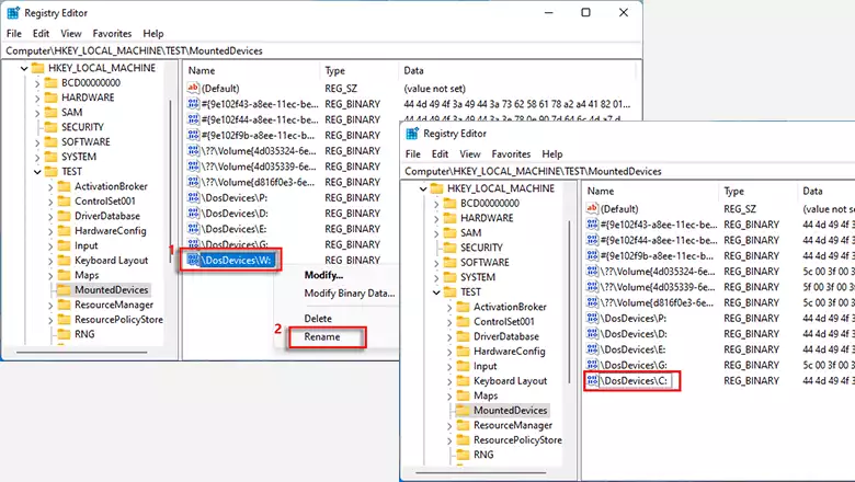 步驟30:同樣,選擇 DosDevicesW: 並將其重命名DosDevicesC:。