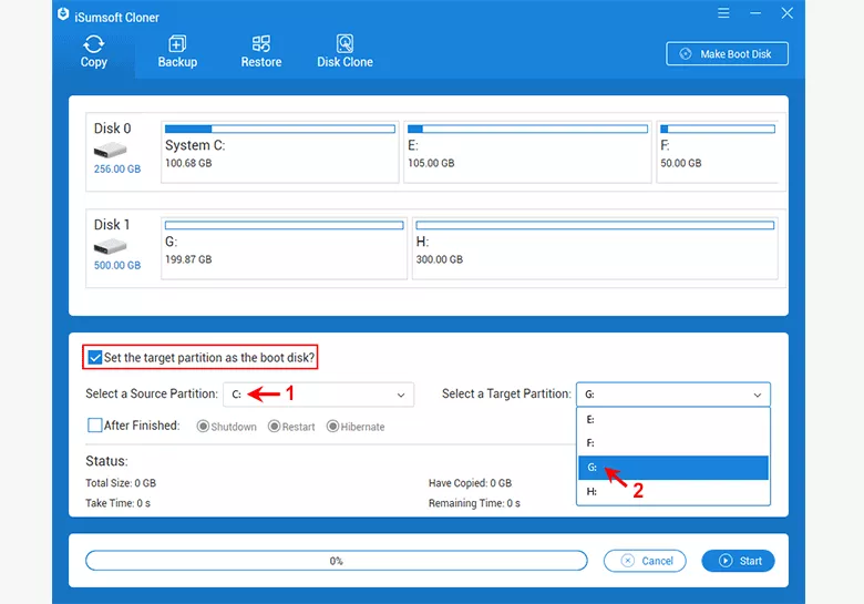 第4步:查看將目標分區設置為啟動盤。在選擇來源